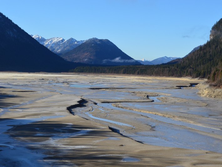 Der türkis schimmernde Sylvensteinsee wirkt durch seine langgezogene Form und die unverbaute Berglandschaft im Umgriff wie ein Fjord.